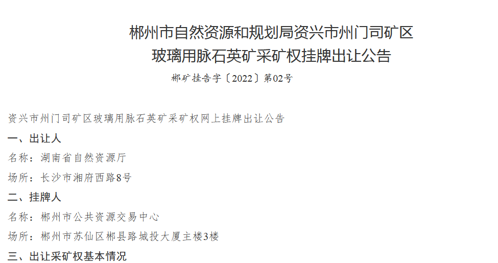 中國粉體網訊 2022年3月31日,郴州市自然資源和規劃局發布了資興市州門司礦區玻璃用脈石英礦采礦權掛牌出讓公告(郴礦掛告字〔2022〕第02號)。位于資興市蘭市鄉橫丘村的1宗資源儲量844.12萬噸的玻璃用脈石英礦、建筑用花崗巖礦采礦權掛牌出讓,擬定起始價3300萬元,凈礦出讓成本8600萬元,總價11900萬元。