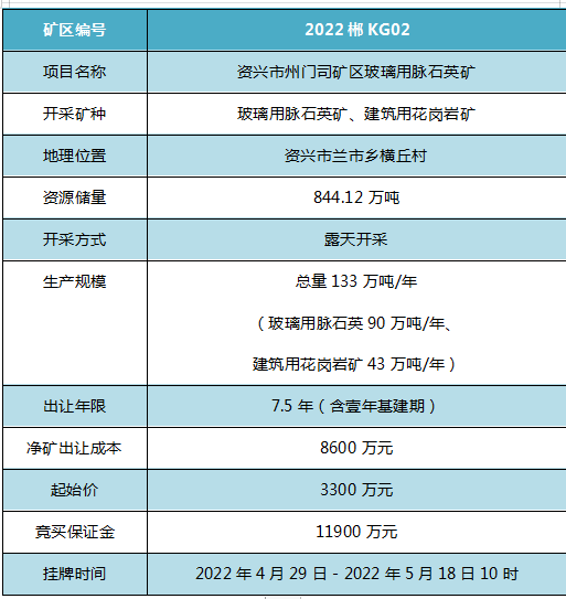 根據《湖南省資興市州門司礦區玻璃用脈石英礦資源開發利用方案》評審意見書(湘礦開發評字〔2021〕045號),掛牌出讓的石英礦擬設采礦權設計露天開采,其中,玻璃用脈石英礦可采資源量572.66萬噸、建筑用花崗巖礦可采資源量271.46萬噸、生產規模133萬噸/年(玻璃用脈石英90萬噸/年、建筑用花崗巖礦43萬噸/年)、服務年限6.4年。