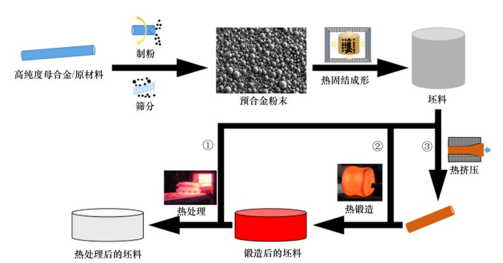 粉末高溫合金的制備主要涉及到粉末的制備、粉末熱固結(jié)成形、熱處理等工藝過程,如圖1所示。主要采用的加工路線有3種:①制粉+熱固結(jié)成型+熱處理;②制粉+熱固結(jié)成型+熱鍛造+熱處理;③制粉+熱固結(jié)成型+熱擠壓+熱鍛造+熱處理。[9]