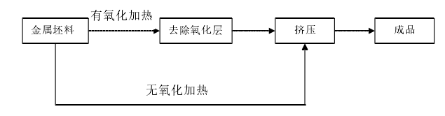 熱擠壓是指將坯料加熱至再結(jié)晶溫度以上,使其在強(qiáng)烈的擠壓力作用下,從擠壓模口中流出或流入細(xì)小的模腔中,最終獲得所需加工件的壓力加工方法。通常熱擠壓的工藝為:首先將坯料加熱到需要的溫度,若坯料表面有氧化皮產(chǎn)生,則應(yīng)立即將其去除,之后立即將坯料裝填入型腔內(nèi)進(jìn)行擠壓,經(jīng)過單道次擠壓即可得到所需工件。其工藝流程如圖5所示。