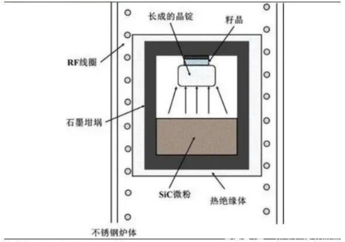 與傳統(tǒng)的單晶硅使用提拉法制備不同,目前規(guī)模化生長SiC單晶主要采用物理氣相輸運法(PVT)或籽晶的升華法。這也就帶來了SiC晶體制備的兩個難點: