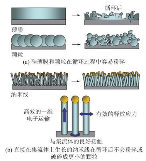 一維硅納米材料包括硅納米線和硅納米管(SiNW)、硅納米纖維等,這種材料為Li+提供了連續的通道,同時一維硅納米結構與電極集流體之間有著很好的接觸,減少了對粘結劑的使用。
