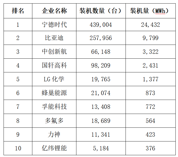 TOP10企業(yè)分別為寧德時代、比亞迪、中創(chuàng)新航、國軒高科、LG化學(xué)、蜂巢能源、孚能科技、多氟多、力神、億緯鋰能。