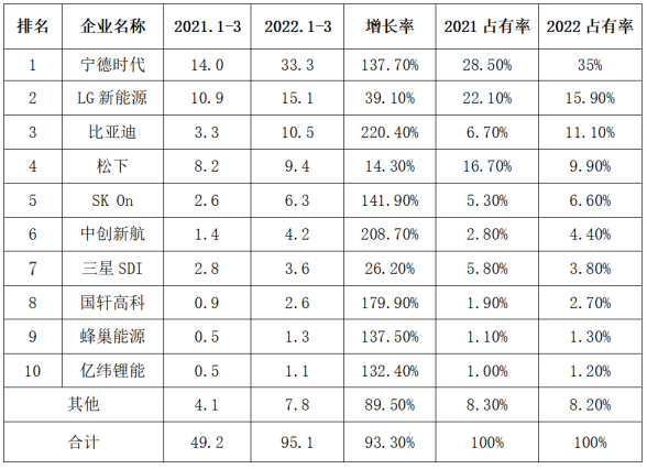 2022年一季度全球動力電池裝機量TOP10統(tǒng)計表(單位GWh)