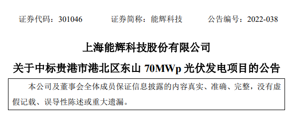 中國粉體網(wǎng)訊 2022 年 5 月 6 日,上海能輝科技股份有限公司(以下簡稱“能輝科技”)收到貴港市港北區(qū)東山 70MWp 光伏發(fā)電項(xiàng)目工程總承包中標(biāo)通知書,公司被確定為該項(xiàng)目的中標(biāo)單位。