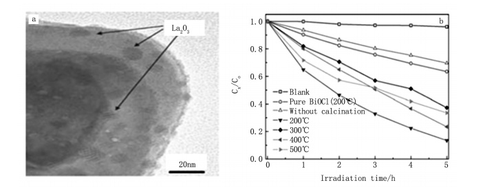 研究結果表明,經過研磨-焙燒得到的La2O3/BiOCl復合光催化劑均具有較好的結晶性能。通過透射電鏡觀察到2nm~5nm的La2O3納米粒子粘附在BiOCl納米片表面。