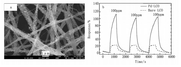 一些專家采用靜電紡絲法制備了200nm~800nm的LaCoO3介孔納米線,并發現LaCoO3納米線是多晶的,單個晶粒尺寸30nm~60nm,然后通過Pd納米點對LaCoO3納米線進一步功能化,功能化的Pd-LaCoO3納米線在250℃較低的工作溫度下對100×10-6CO有極高的靈敏度達到113.6,并且有穩定的響應。