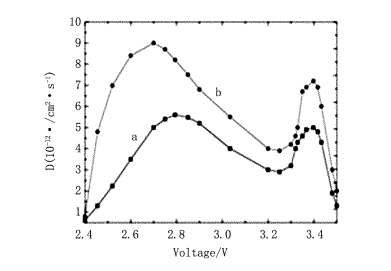 純LiFePO4電極(a)及3.0%La2O3/Li2O/TiO2的LiFePO4電極(b)不同電壓范圍的擴散系數