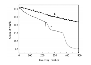 另外還考察了多次循環后的性能,發現在500次循環后涂3.0%La2O3/Li2O/TiO2的LiFePO4的電池容量保持率高達86.5%,而未涂3.0%La2O3/Li2O/TiO2的LiFePO4電池容量保持僅為64.5%。