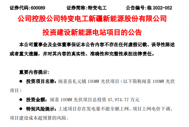 中國粉體網(wǎng)訊 5月16日晚間,特變電工公告稱,為搶抓市場機(jī)遇,加快光伏資源的開發(fā),控股公司特變電工新疆新能源股份有限公司(以下簡稱“新能源公司”)擬投資建設(shè)聞喜縣禮元鎮(zhèn)100MW光伏項(xiàng)目,投資金額約4.8億元。
