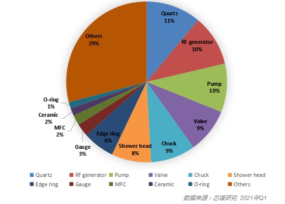2020年,中國大陸晶圓線8吋和12吋前道設(shè)備零部件(parts)采購金額超過10億美元。如果排除三星、海力士、臺積電等境外廠商在中國大陸的產(chǎn)線,中國本土晶圓制造廠商(主要包括中芯國際、華虹集團、華潤微電子、長江存儲等)采購金額(口徑統(tǒng)一為8吋和12吋前道設(shè)備零部件,后文同)約為4.3億美元。中國晶圓制造廠商采購的設(shè)備零部件主要有石英(Quartz)、射頻發(fā)生器(RF Generator)、各種泵(Pump)等,占零部件采購金額的比重達到或超過10%。此外,各種閥門(Valve)、吸盤(Chuck)、反應(yīng)腔噴淋頭(Shower Head)、邊緣環(huán)(Edge Ring)等零部件的采購占比也比較高。