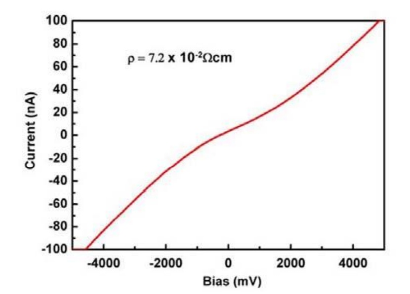氮化硅納米線作為半導體材料具有光照下能產生光電流的基本性能。納米線的形態使得氮化硅的間接能帶結構轉變為了直接能帶結構,還可以通過摻雜產生中間帶,導致對陽光的吸收增強。同時,共摻雜能使氮化硅納米線帶有鐵磁性,可以提高載流子的遷移率。這些性質說明了氮化硅納米線可以被用于太陽能的收集,其在太陽能轉換裝置中具有潛在應用價值。研究人員利用原位透射電鏡測出了α-Si3N4納米線的電阻為7.2×10-2Ω·cm,其V-I特性曲線如下圖所示,具有典型的半導體伏安曲線特征。