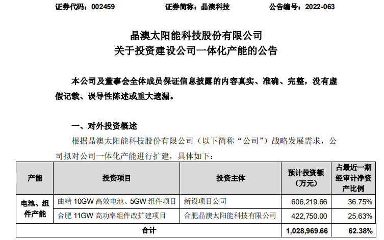 根據公告,晶澳科技擬投建項目包括曲靖10GW高效電池、5GW組件項目及合肥11GW高功率組件改擴建項目,預計投資額達102.9億元,占最近一期經審計凈資產的62.38%。