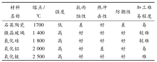 熔融石英陶瓷是美國麻省理工學院20世紀60年代研制出的一種材料。我國也用石英陶瓷制備了防空導彈天線罩并得到了應用。該材料介電常數和介電損耗很低,且對溫度和電磁波頻率十分穩定,熱膨脹系數低,但是力學性能不佳,強度較低(45~70MPa),斷裂韌性較低,抗雨蝕性較差,不適合用在5Ma以上的導彈上。