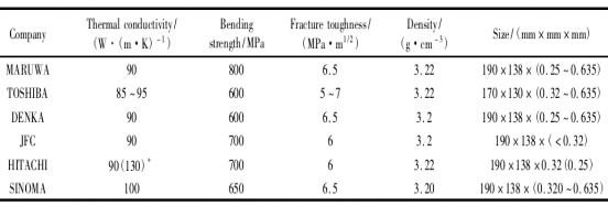 國際上主要的高導熱氮化硅陶瓷生產商有東芝集團(TOSHIBA)、日本電氣化學(DENKA)、日本丸和(MARUWA)、日本精細陶瓷(JFC)、日立金屬株式會社(HITACHI)。商用高導熱氮化硅陶瓷的熱導率在85W/(m·K)以上,抗彎強度為600~850MPa,斷裂韌性為5.0~7MPa·m1/2。日立公司對氮化硅基板進行了特殊的活化工藝處理,熱導率可以達到130W/(m·K),其他力學性能不變。不同企業生產的氮化硅陶瓷性能各有特點,這些性能差異與各廠商之間不同的生產工藝和目標市場定位有關。