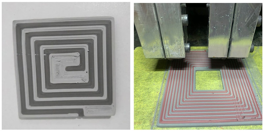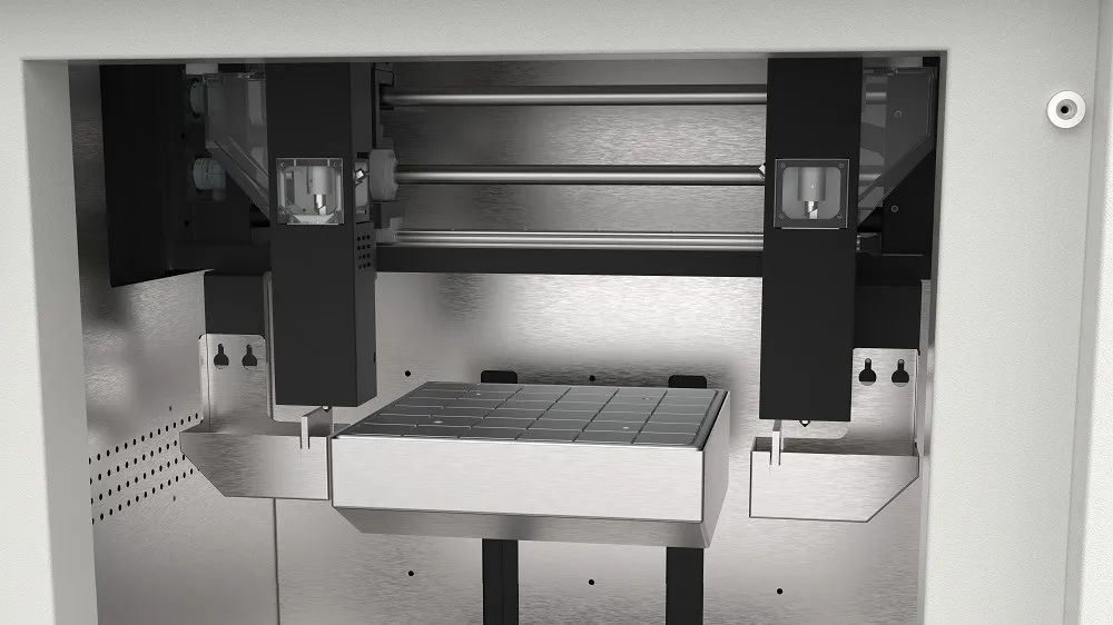 雙噴嘴功能描述:兩個獨立噴嘴各司其職,同步進行完全相同的打印運動。雙噴嘴復制打印兩個產品比單噴嘴打印兩個產品的時間縮短了一半。