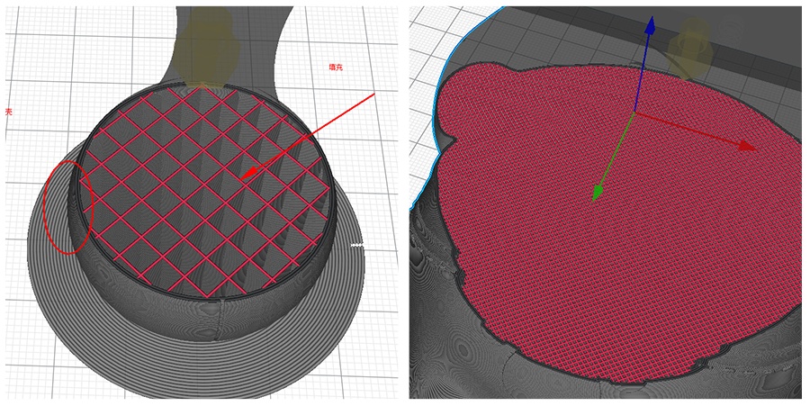 打印模型情況:通常一個產品模型,在切片軟件中可以細分為外殼、內殼、填充、上頂、下底、填充等不同部位;為了讓同一個產品具有不一樣的性能或功能或實現特殊產品的開發,可以對不同部位指定不同的材料A或B來進行打印。