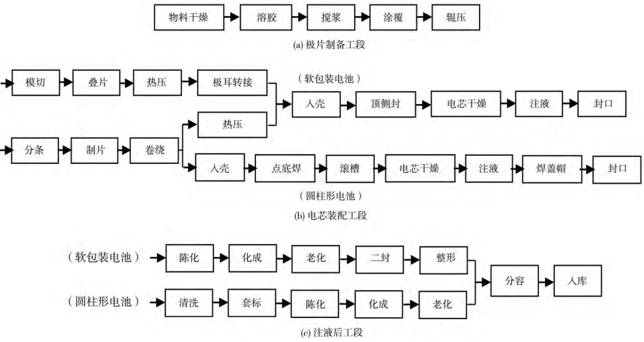 以圓柱形鋰離子電池為例,從整體來(lái)看,電池生產(chǎn)工序可以概括為3大工段,21道工序。3大工段分別是前段工序(極片制備)、中段工序(電芯裝配)、后段工序(化成封裝)。21道工序分別是負(fù)極勻漿、正極勻漿、涂布、輥壓、分切、制片、卷繞、入殼、底焊、滾槽、烘烤、注液、焊接、封口、清洗、套膜、活化、化成、陳化、分選、分容。