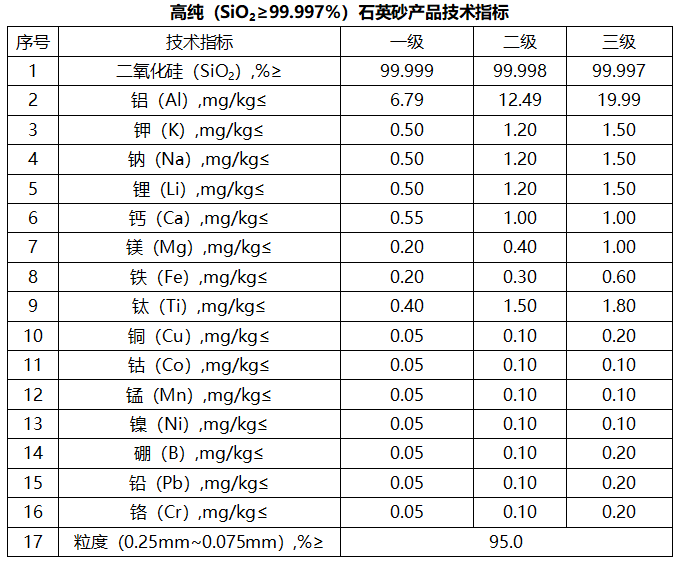 湖南省曾于2016年公布地方標準DB43/T1167-2016高純(SiO2≥99.997%)石英砂,標準適用于以天然石英礦物為原料,經酸浸、煅燒、水淬、烘干、粉碎、篩分、提純、色選、磁選等工序加工而成的石英砂。