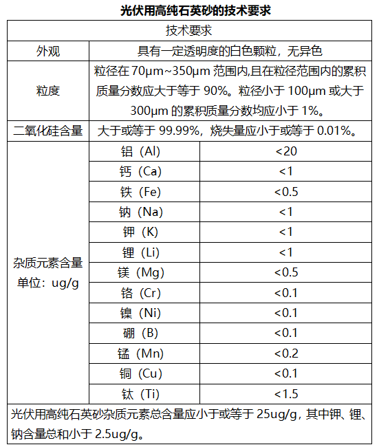 國家標準GB/T32649-2016光伏用高純石英砂于2016年11月1日開始實施,標準適用于光伏用高純石英砂,產品用于多晶硅、單晶硅光伏生產用的擴散管、承載器及電弧法坩堝等石英制品。該標準從外觀、粒度、二氧化硅含量、雜質元素含量等方面作出了如下技術要求。