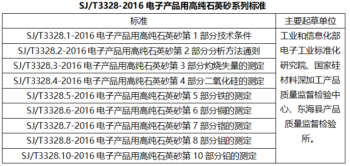 其中,SJ/T3328.1-2016電子產品用高純石英砂第1部分技術條件適用于電子產品用高純石英砂,可用于制造半導體石英器件的管、棒、塊、板、片以及坩堝等器件。技術要求如下: