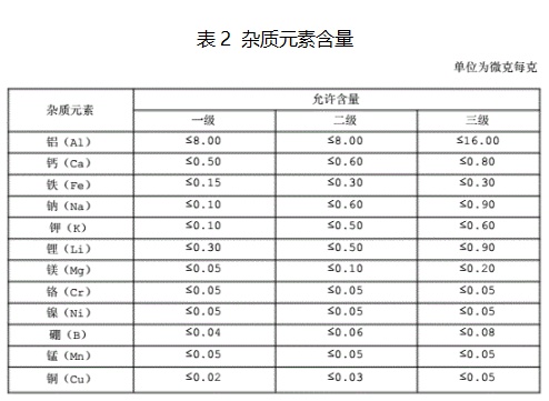 雜質元素含量:應符合表2規定。