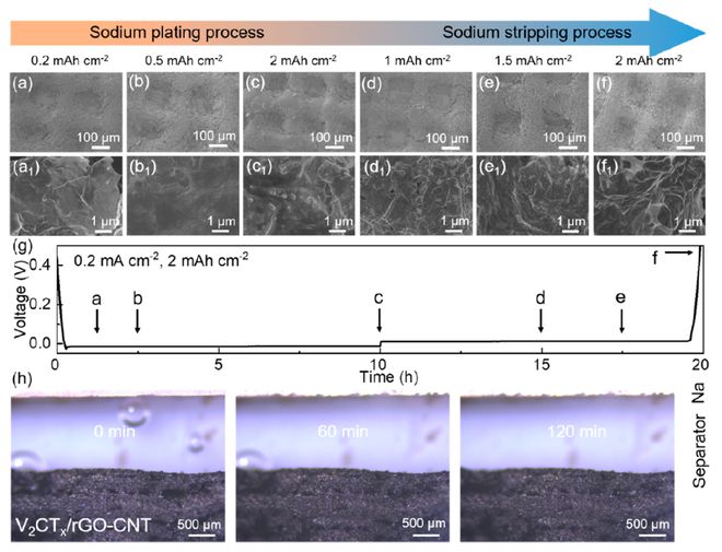 2.這種3D打印的V2CTx/rGO-CNT微網格具有以下優勢:(1)大的比表面積可以顯著降低電流密度并為鈉沉積提供豐富的成核中心;(2)3D打印的人工分級多孔結構不僅促進了電解液的滲透,保證了電解液與活性材料的緊密接觸,而且大大提高了離子傳輸速率,緩解了電極體積膨脹;(3)原位TEM、原位SEM、原位光學顯微鏡和密度泛函理論(DFT)模擬結果證實,親鈉性V2CTxMXene納米薄片與鈉離子具有高結合能,可有效提高Na成核和沉積穩定性。