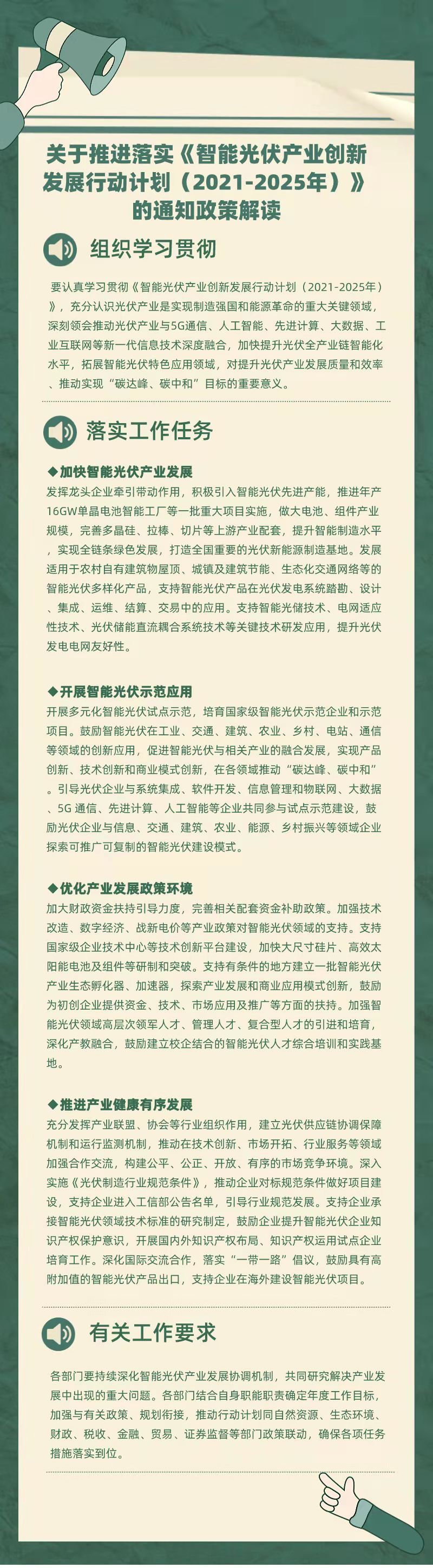 光伏產業是實現制造強國和能源革命的重大關鍵領域,將光伏產業與新一代信息技術深度融合,可以提升光伏全產業鏈智能化水平,以及光伏產業發展質量和效率。今年1月,工業和信息化部、住房和城鄉建設部、交通運輸部、農業農村部、國家能源局合發布《智能光伏產業創新發展行動計劃(2021-2025年)》,提出,到2025年,光伏行業智能化水平顯著提升,產業技術創新取得突破。