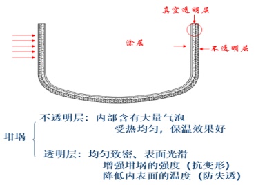 早期的石英坩堝是全透明的結(jié)構(gòu),這種透明的結(jié)構(gòu)容易導致不均勻的熱傳輸條件,增加晶棒生長的難度,且均勻的結(jié)構(gòu)對高品質(zhì)的高純石英砂需求較大,成本較高,因此這種石英坩堝的制備方法基本被淘汰。