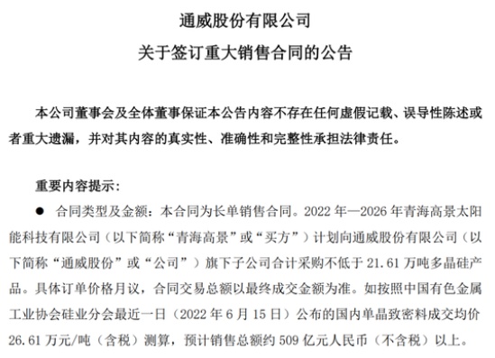 中國粉體網訊 6月18日,通威股份有限公司(以下簡稱“通威股份”)發布關于簽訂重大銷售合同的公告。公告稱,2022年—2026年青海高景太陽能科技有限公司(以下簡稱“青海高景”)計劃向通威股份有限公司旗下子公司合計采購不低于21.61 萬噸多晶硅產品。具體訂單價格月議,合同交易總額以最終成交金額為準。