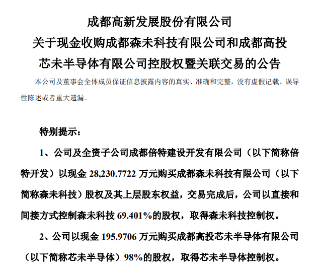 6月19日,成都高新發展股份有限公司(簡稱“高新發展”)發布公告,公司及全資子公司成都倍特公司(簡稱“倍特開發”)將以現金2.82億元購買成都森未科技有限公司(以下簡稱“森未科技”)股權及其上層股東權益。