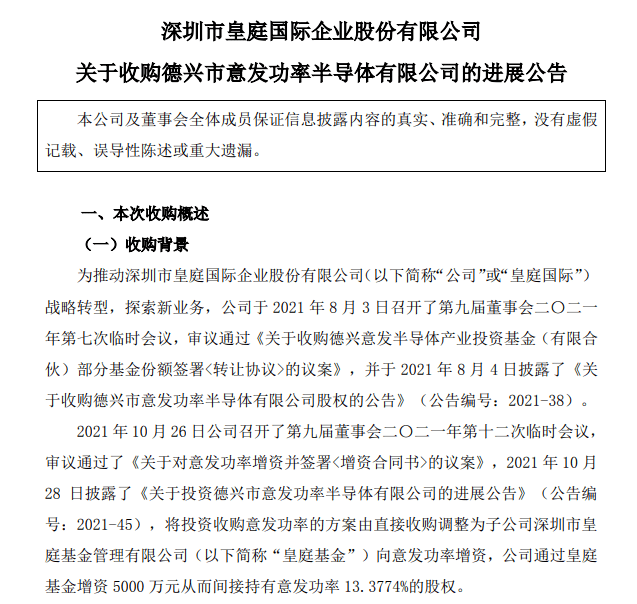 6月17日,深圳市皇庭國際企業股份有限公司(以下簡稱“皇庭國際”)發布公告稱,公司全資子公司深圳市皇庭基金管理有限公司(以下簡稱“皇庭基金”)近日簽署股權轉讓協議,擬收購ZHOU BING和寧波意發分別持有的德興市意發功率半導體有限公司(簡稱“意發功率”)9.67%、4.76%股權,價格分別為5561萬元和2739萬元。