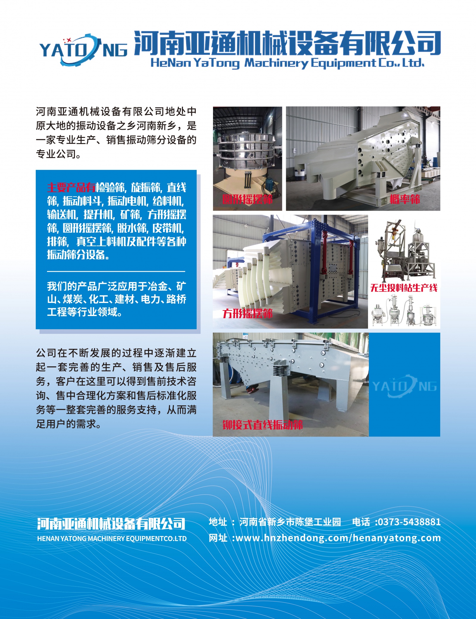 河南亞通機械設備有限公司地處中原大地的振動設備之鄉河南新鄉,是一家專業生產、銷售振動篩分設備的專業公司。主要產品有檢驗篩,旋振篩,直線篩,振動料斗,振動電機,給料機,輸送機,提升機,礦篩,方形搖擺篩,圓形搖擺篩,脫水篩,皮帶機,直排篩,概率篩,真空上料機及配件等各種振動篩分設備。我們的產品廣泛應用于冶金、礦山、煤炭、化工、建材、電力、路橋工程等行業領域。