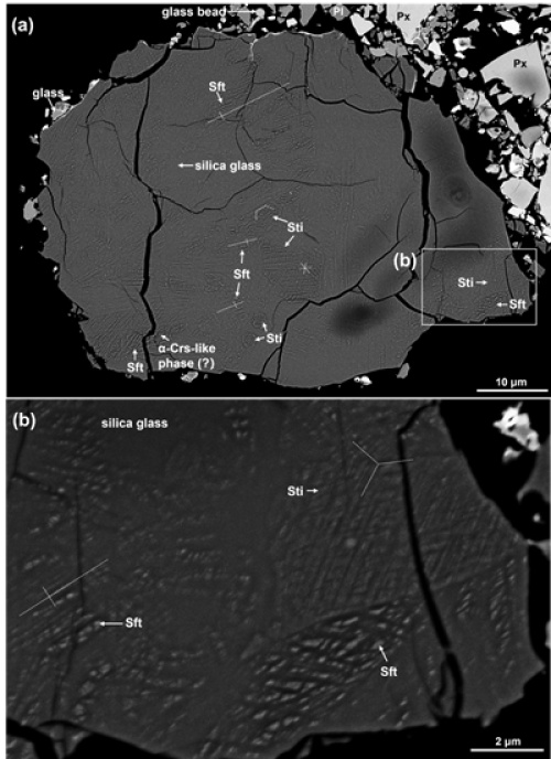 圖2.嫦娥五號月壤樣品中含賽石英(Sft)和斯石英(Sti)的二氧化硅碎屑(背散射電子圖像);α-Crs-like phase:似α-方石英的二氧化硅相Pl:長石;Px:輝石