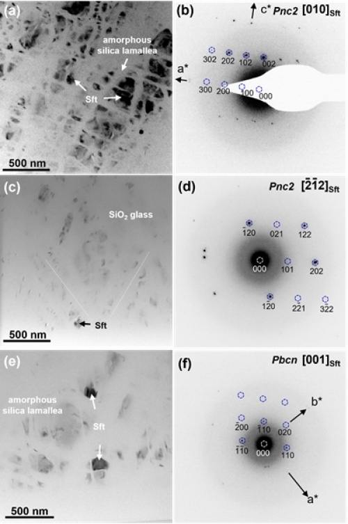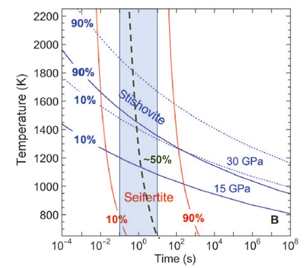 賽石英(α-PbO2結(jié)構(gòu))和斯石英(金紅石型結(jié)構(gòu))作為兩個重要的二氧化硅超高壓相,在固體化學(xué)、地球物理以及行星科學(xué)等領(lǐng)域具有重要研究價值。斯石英在受沖擊隕石(普通球粒隕石、火星隕石、月球隕石、灶神星隕石等)中較為常見,其形成機理相對清晰;而賽石英僅在幾塊火星隕石和一塊月球隕石中發(fā)現(xiàn),其形成機制未得到充分認(rèn)識。此外,高溫高壓實驗和理論計算顯示,賽石英的穩(wěn)定壓力較高(>100 GPa),因此常被當(dāng)成超高壓的指示礦物。然而,自然界中能產(chǎn)生如此高沖擊壓力的撞擊事件十分罕見。特別是考慮到賽石英的熱穩(wěn)定性較差,而高沖擊壓力往往伴隨較高的溫度,因此,賽石英的出現(xiàn)能否指示超大撞擊事件有待商榷,隕石中斯石英和賽石英的共存機理仍不清楚。