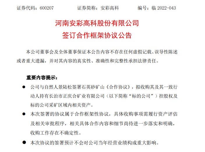 中國粉體網訊 6月23日晚間公告顯示,安彩高科6月22日與自然人景陸松簽訂合作協議,公司擬收購景陸松及其一致行動人持有長治市正慶合礦業有限公司(下稱“標的公司”)的控股權及標的公司采礦區域內相關資產。