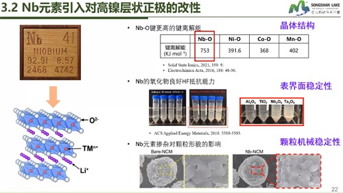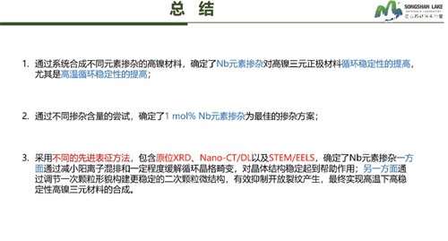 熱穩定性不佳,高溫環境條件下電化學性能衰退明顯,是高鎳三元材料面臨的難題之一。哈工大(威海)松山湖材料實驗室的朱永明教授從體相摻雜方面入手,跟我們分享了鈮摻雜制備高穩定高鎳三元材料的研究。摻雜可以從微觀上穩定材料結構,改善電化學性能,且操作難度小,改性效果明顯,是較易實現的改性方法。實驗證明1mol%的鈮摻雜為最佳的摻雜方案,鈮元素摻雜可以提高高鎳三元正極材料的循環穩定性。鈮元素對多晶高鎳正極出色的改性效果,為多晶材料的發展提供了可能。