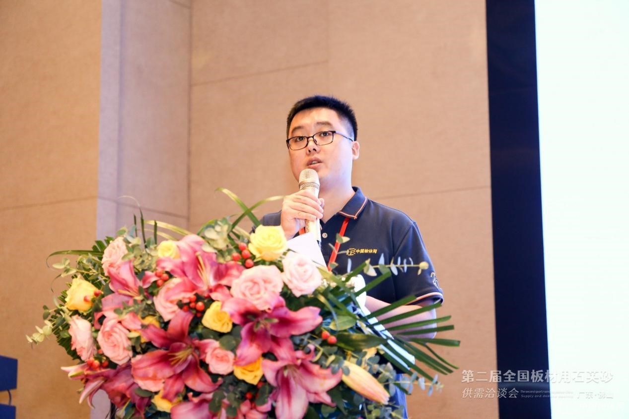 李勇副總經理兼總工程師首先從石英石礦石來源、石英砂制作過程、石英石板材用砂等方面介紹了石英石的生產原料,然后石英石成品加工,如櫥柜臺面加工、窗臺板加工、衛浴臺面加工等。最后,憑借多年的經驗研究,分析了石英石的主要應用領域,并對石英石行業的未來發展做出展望。