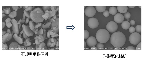 氧化鋁用作原料時,一般不需要經過化學反應僅需要物理變化就可以獲得球形氧化鋁顆粒。其本質是在短時間內利用高溫實現相變,同時利用表面張力的作用使顆粒球化。當使用無規則氧化鋁作為原料時,產物具有產率高、形貌規則和低污染的優點。能獲得具有低團聚和高分散性能的球形粉末,但是其裝置要求高、設備價格高、能耗高。