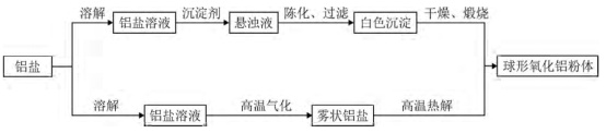 該方法以硝酸鋁、氯化鋁和硫酸鋁等不同鋁鹽為原料制備球形氧化鋁粉體。以硝酸鋁為原料制備球形氧化鋁粉體時,常用均相沉淀法和噴霧熱解法,以氯化鋁和硫酸鋁為原料制備球形氧化鋁粉體時,制備方法常采用液相沉淀法。以鋁鹽為原料的制備流程圖如下圖所示,以鋁鹽為原料制備球形氧化鋁粉體時,操作方法簡單,所獲產物球化率高、雜質較少,但原料價格相對較貴,部分鋁鹽制得的氧化鋁經過煅燒后產生的氣體污染性強,這些缺點使得其大規模工業化使用受到一定的阻礙。