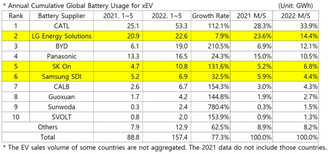 從數據可以看到,寧德時代的市場份額為33.9%,遠超第二名的LG新能源,并且還在穩步提升中,可以說是動力電池領域當之無愧的頭部廠商。除此之外,比亞迪靠著刀片電池也在動力電池市場大放異彩,以19.0GWh的電池裝車量排在了第三的位置。而三家韓企總的全球市占率同比下滑9.1個百分點,為25.6%。