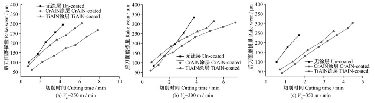 實(shí)驗(yàn)刀具不同切削速度下的磨損曲線(來(lái)源:阮銘業(yè)等,《氮硅涂層陶瓷刀具切削鑄鐵磨損機(jī)理研究》)