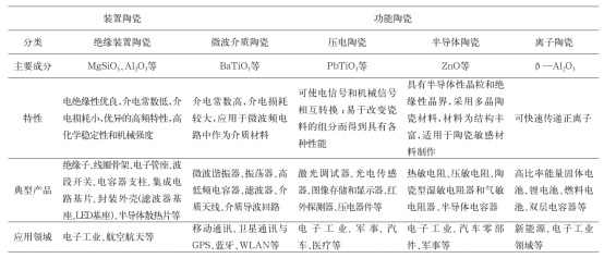 從用途上來講,電子陶瓷可以分為絕緣裝置陶瓷、離子陶瓷、半導體陶瓷、壓電陶瓷和電容器陶瓷5類。各類陶瓷的主要成份、特性及主要應用領域如下表所示。