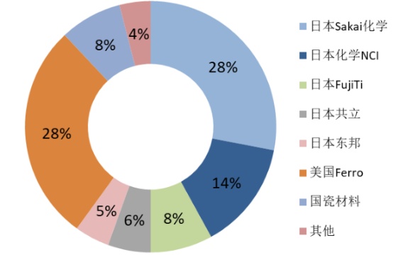 目前,日本是全球電子陶瓷粉體的最大生產國(約65%市場份額),其中日本堺化學工業株式會社(Sakai)是全球電子陶瓷粉體材料的最大生產商,約占全球市場份額的28%。其次是美國福祿公司(Ferro)和日本碳素株式會社(日本NCI),分別占比約28%、14%。山東國瓷功能材料股份有限公司、日本富士鈦工業株式會社(日本FujiTi)、日本共立材料株式會社(日本KCM)、日本東邦電子株式會社(日本東邦)分別占約8%,8%,6% 。