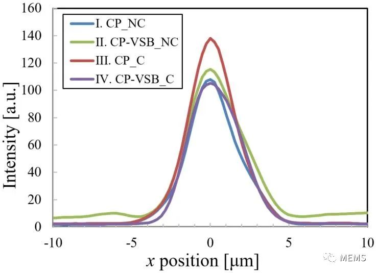 本論文的研究表明,精確設計的由c-Si制成的納米柱可以應用于超構表面,并能取得令人滿意的結果,即使在可見光波段。作者們設計了四種線聚焦超構表面透鏡,以驗證可見光波段的硅納米柱超構透鏡性能的有效性。此外,結合電子束光刻中的字符投影(CP)和可變形狀束(VSB)模式,研究人員評估了批量生產和精度控制之間的兼容性。他們成功地獲得了由單晶硅納米柱構成的高效率線聚焦超構表面透鏡。在532nm波長下,提出的超構表面透鏡的參數如下:透鏡厚度為300nm;焦距為3.91mm;方形光闌為2mm;數值孔徑為0.25;實測透射率為38.4%~46.8%;焦點處測得的半峰全寬(FWHM)為3.68μm。