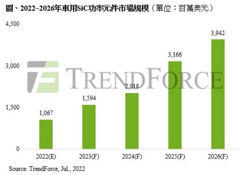 中國粉體網訊 據研究機構TrendForce預測,隨著越來越多車企開始導入碳化硅功率器件,2022年這一市場規模有望達到10.7億美元,2026年將進一步攀升至39.4億美元。