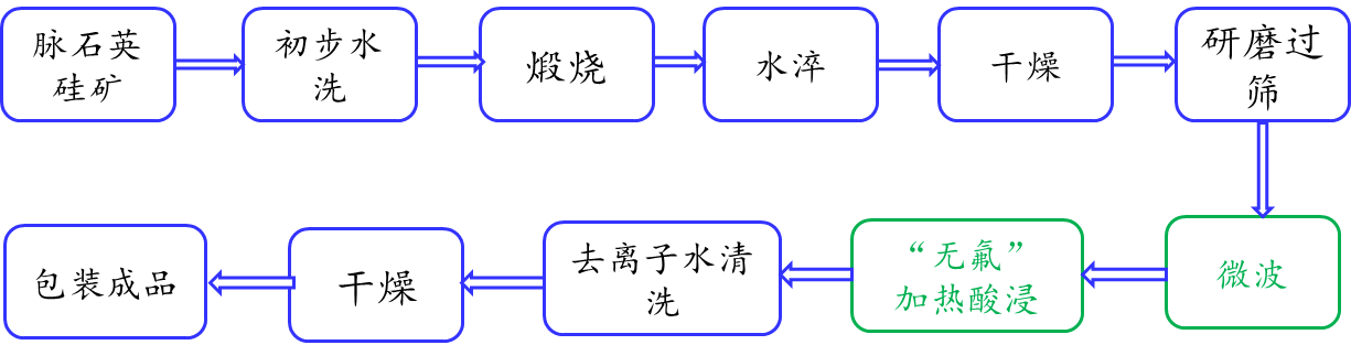 針對傳統(tǒng)高純石英砂精制工藝中的流程長和除雜介質(zhì)殘液污染環(huán)境等問題,侯教授認(rèn)為在符合產(chǎn)品生產(chǎn)技術(shù)要求前題下,可以從縮短簡化工藝流程、減少設(shè)備臺套數(shù)、工藝剔雜介質(zhì)創(chuàng)新等方面作出改變,以實(shí)現(xiàn)節(jié)能減排,降低消耗,改善生產(chǎn)條件,保護(hù)人文生態(tài)環(huán)境的目的。