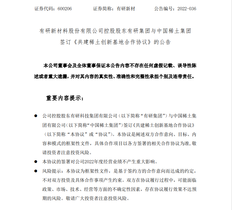 中國粉體網訊 7月19日,有研新材披露公告,公司控股股東有研集團與中國稀土簽訂《共建稀土創新基地合作協議》。