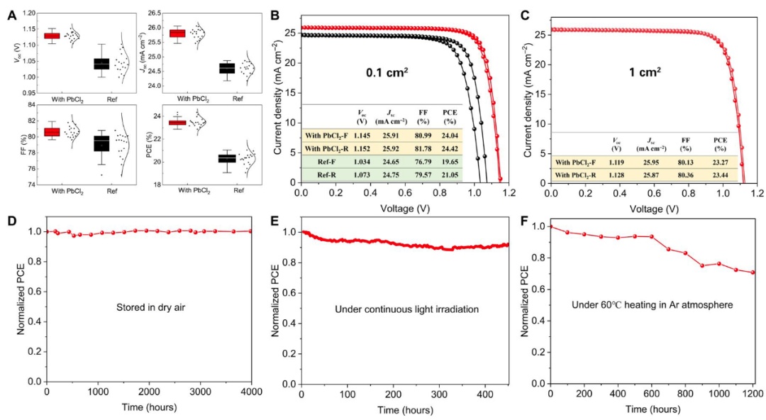 通過該方法制備的太陽能電池表現出了優異的光電性能,在AM1.5G標準光照下取得了最高24.42%的光電轉換效率,刷新了真空蒸鍍法制備鈣鈦礦太陽能電池的效率紀錄,在1cm2和14.4 cm2的大面積器件上分別實現了23.44%和19.87%的光電轉化效率。此外,真空蒸鍍法制備的太陽能電池表現出了良好的穩定性,在干燥空氣中存儲超過4000小時后無衰減,在濕度為35%的環境空氣中儲存1300小時后仍然保持97%的初始效率。該研究結果展示了真空蒸鍍工藝在制備大面積高效率鈣鈦礦太陽能電池的優越性和產業化應用的可行性。