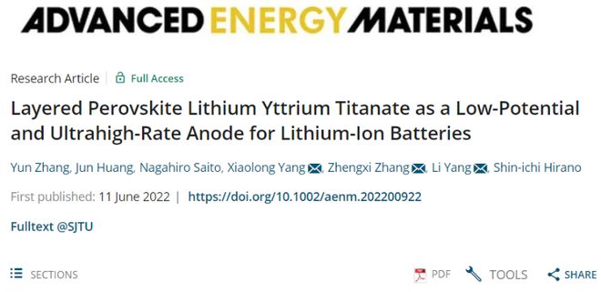 中國粉體網訊 近日,上海交通大學化學化工學院楊立教授團隊與重慶大學楊小龍等人合作,在能源類國際權威期刊《Advanced Energy Materials》上發表了題為“層狀鈣鈦礦結構的鈦酸釔鋰作為低電壓、高倍率鋰離子電池負極材料(Layered Perovskite Lithium Yttrium Titanateasa Low-potential and Ultrahigh-rate Anode for Lithium-ion Batteries)”的研究論文。該論文首次詳細研究了鈦酸釔鋰作為鋰離子電池低電壓、高倍率負極材料的潛在價值,為設計新型儲鋰穩定的低電壓負極材料提供了新的思路。上海交通大學博士生張赟為論文的第一作者,楊立教授、章正熙副研究員和重慶大學楊小龍副教授為論文共同通訊作者,上海交通大學為第一通訊單位。